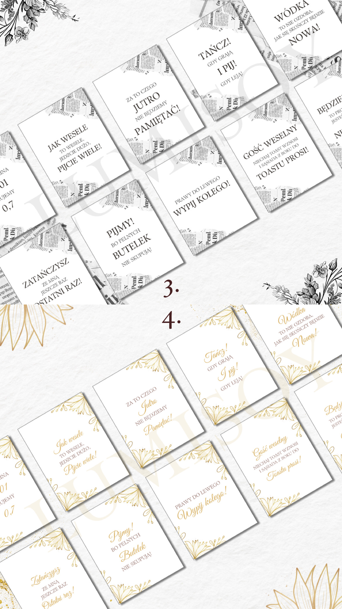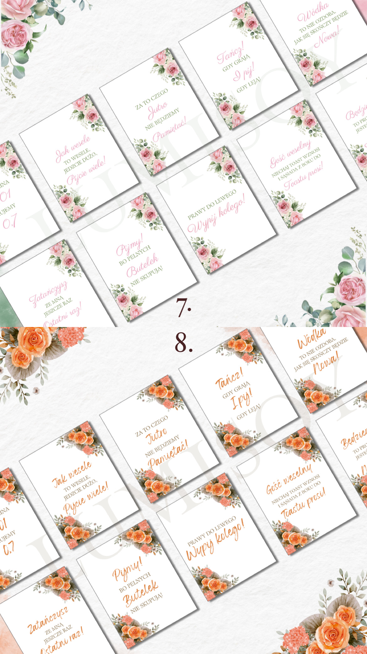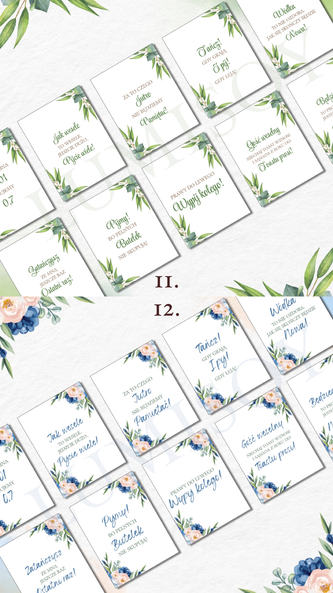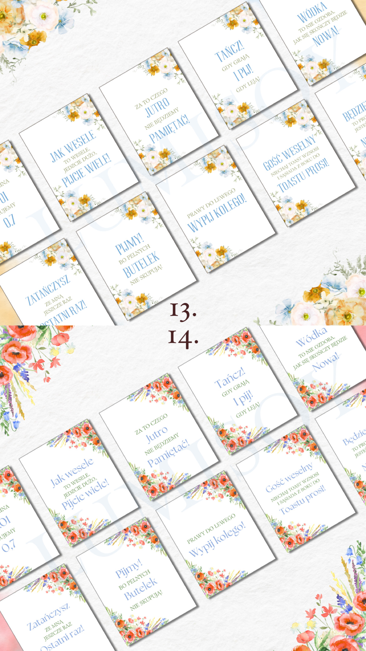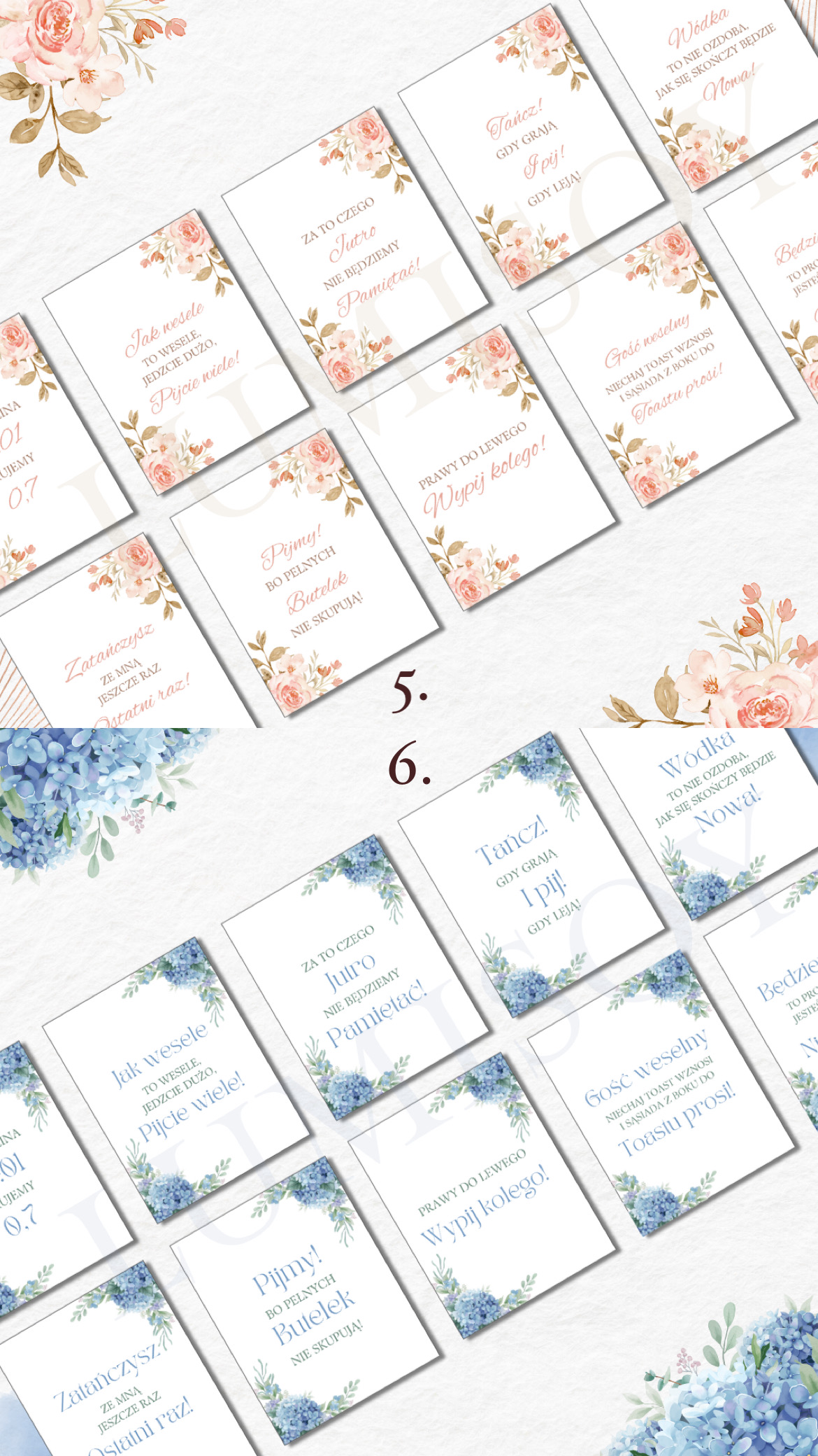 Zawieszki na alkohol – w formacie PDF do wydruku A4 poziomo na 10 stronach (każda strona zawiera 9 szt zawieszek, łącznie 90 szt). Podana cena jest za 1 wersję kolorystyczną 90 sztuk zawieszek z 90 różnymi tekstami podanymi poniżej.