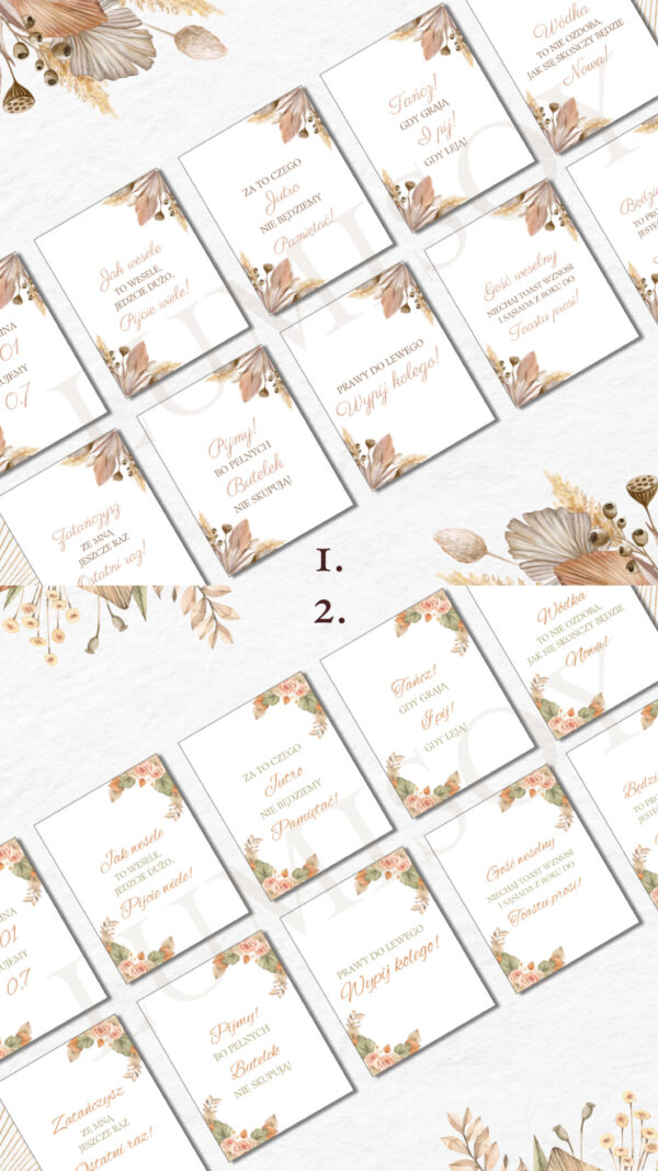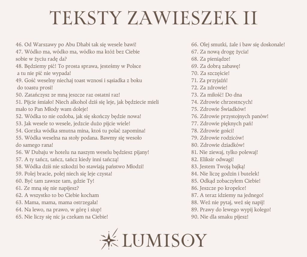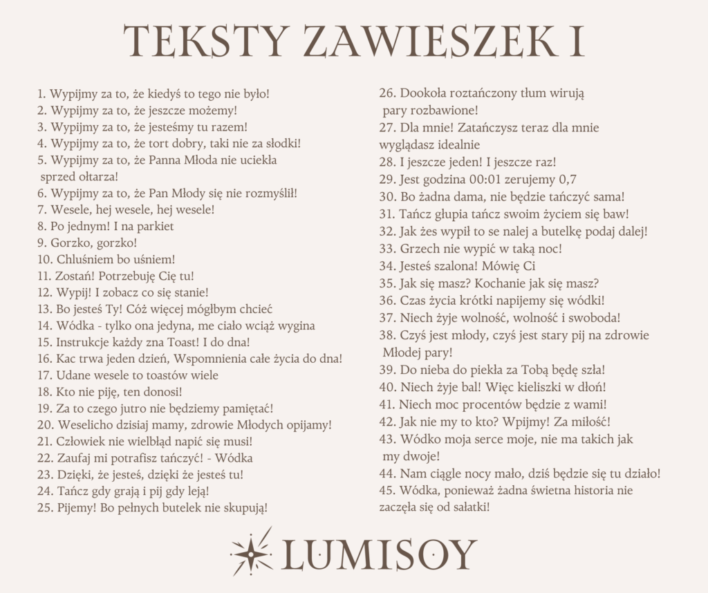 Dodaj wyjątkowy charakter swojemu weselnemu stołowi dzięki eleganckim zawieszkom na alkohol! Teksty zawierają refreny piosenek, zabawne wierszyki i toasty, wprowadzą gości w radosny nastrój i zachęcą do wspólnej zabawy.