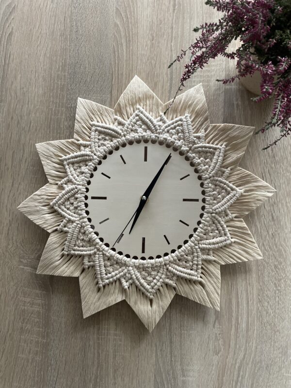 Ręcznie pleciony zegar makrama wykonany ze sznurka 3 mm w kolorze Ecru. Delikatne sploty tworzą efektowną ramę w stylu boho, dzięki której zegar staje się nie tylko funkcjonalny, ale też piękną dekoracją wnętrza. Neutralny odcień Ecru idealnie wpasuje się w każdy styl – od minimalistycznego po rustykalny.