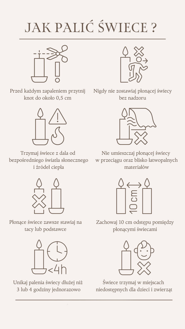 | Bezpieczeństwo produktu: | Nie umieszczaj świecy na, oraz w pobliżu źródeł ciepła. Przed zapaleniem świecy skróć knot do długości około 0,5cm., Nie zostawiaj świecy bez dozoru. Zawsze używaj podstawki. Trzymaj świece z dala od dzieci i zwierząt., Oczyszczaj warstwę stopionego wosku z resztek zapałek oraz zanieczyszczeń. Nie przesuwaj ani nie przenoś zapalonej świecy. Nie używaj płynów do gaszenia płomienia świecy., Zachowaj odstęp pomiędzy świecami minimum 10cm. Nie stawiaj zapalonej świecy na łatwopalnych przedmiotach oraz ich pobliżu. Nie stawiaj świecy w przeciągu. |